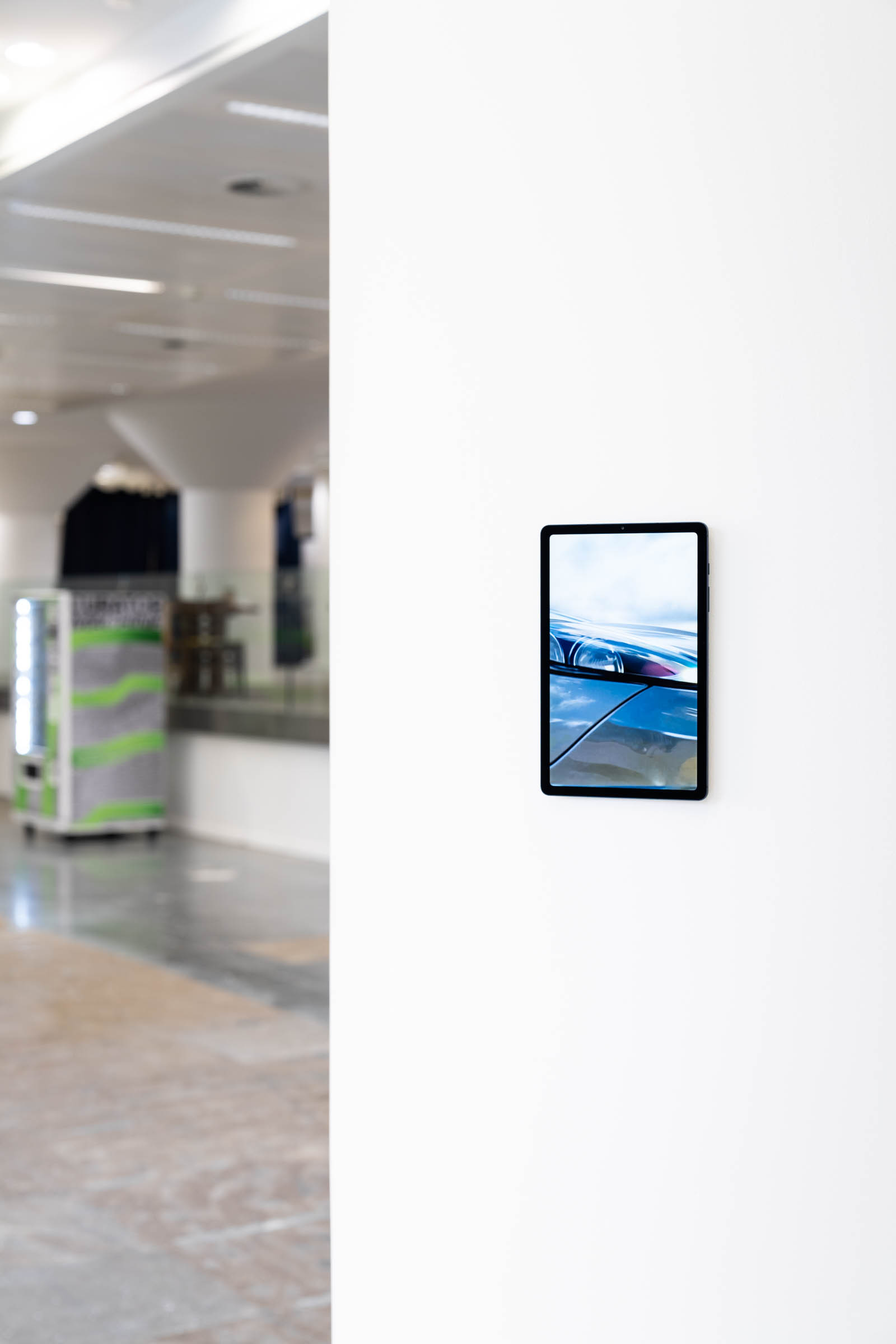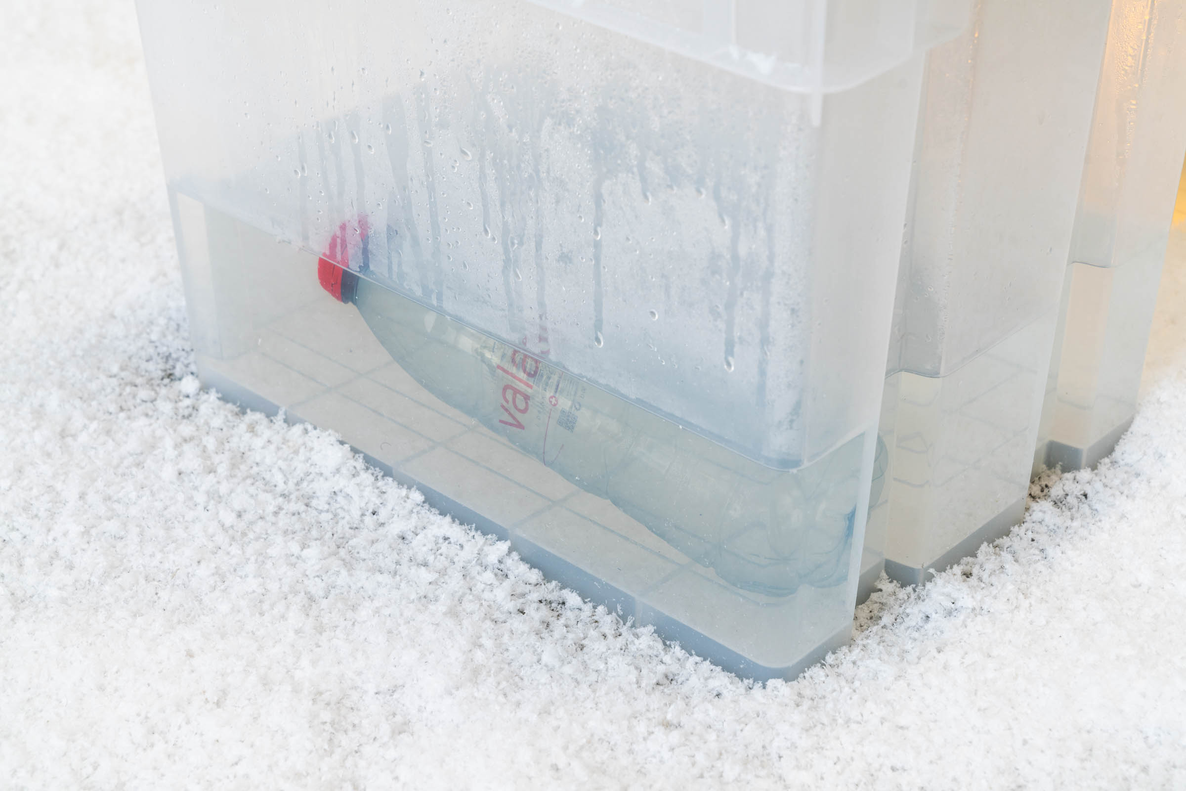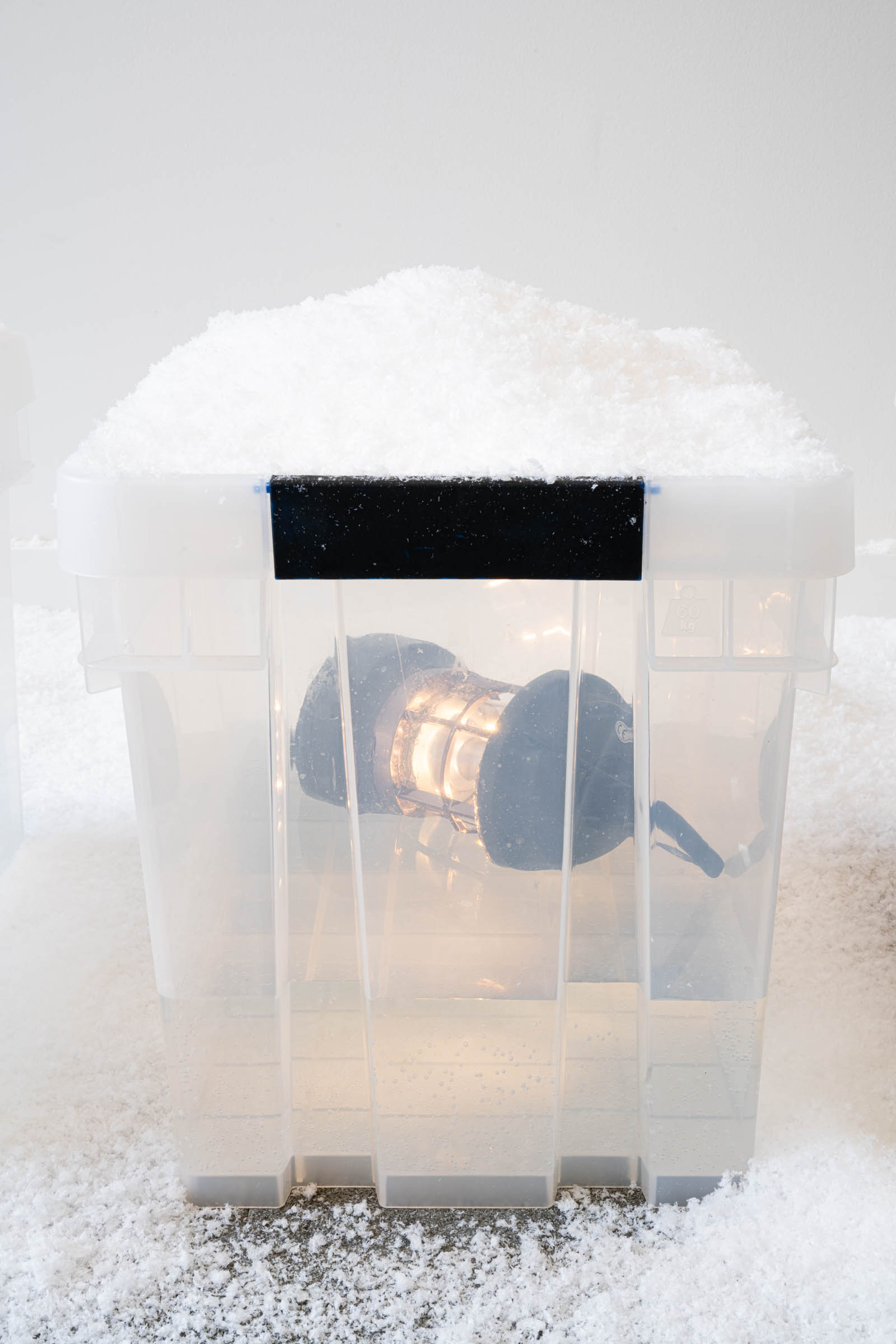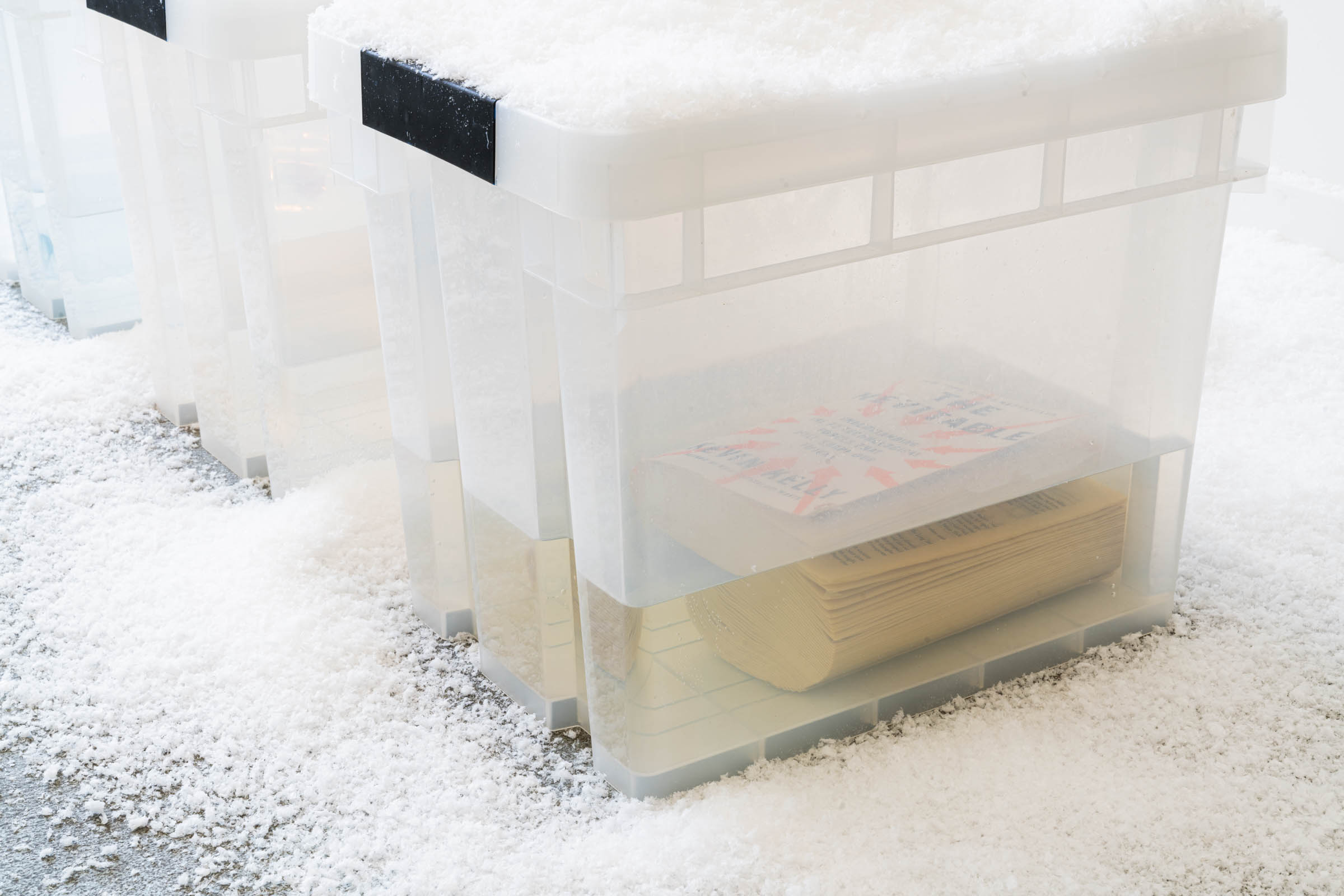 A snow machine atop our booth gently blankets the space in a continuous snowfall, accumulating in corners and settling on artworks. Visitors navigate the shifting landscape, their footsteps etching paths into the snow.
