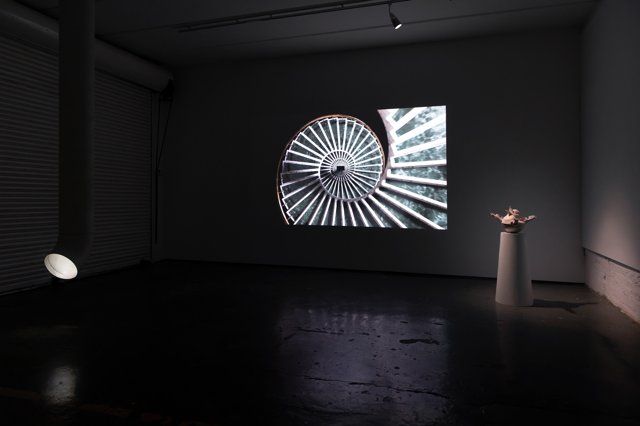 Penrose Helix alludes to the theme of surveillance via the motif of the tower. Towers are landmarks, international figures that typify the idea of progress. In this sense it is no surprise that they are powerful symbols to dismantle, as proven by the attacks of 9/11. The United States no longer boasts the tallest towers; contemporary military superpowers send the top of the tower — the all-seeing eye — straight to space with a rocket, skipping the need for spiral staircases altogether. Down below on the surface, their market system still relies on the ascension of a staircase, but similarly to the Super Mario 64 obstacle ‘Endless Stairs’, the capitalist staircase can forever be climbed, without making any progress. The capitalist model is based on an infinite game of inflation and deflation, where value must be diminished in order to progress. The height and depth of the tower have been reduced to a Penrose model. We are caught in a two-dimensional reality where positioning and locating oneself becomes near impossible. Ascension has become illusional, and we no longer know who the observer is and who the observed.